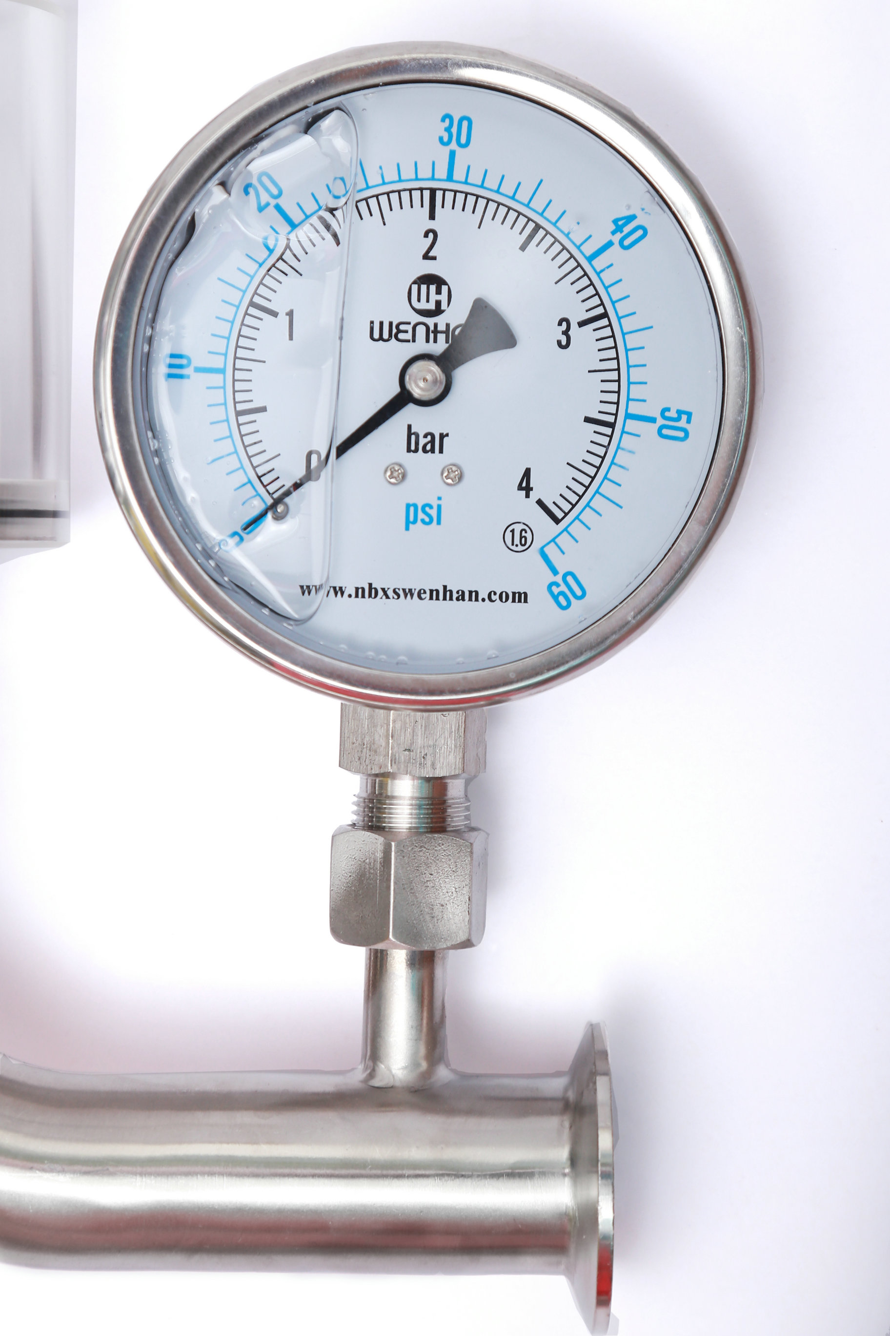 Wh-5101B鏈接;快裝 卡箍 壓力表,表盤Φ100. 壓力范圍0-4bar . M20*1.5 防震